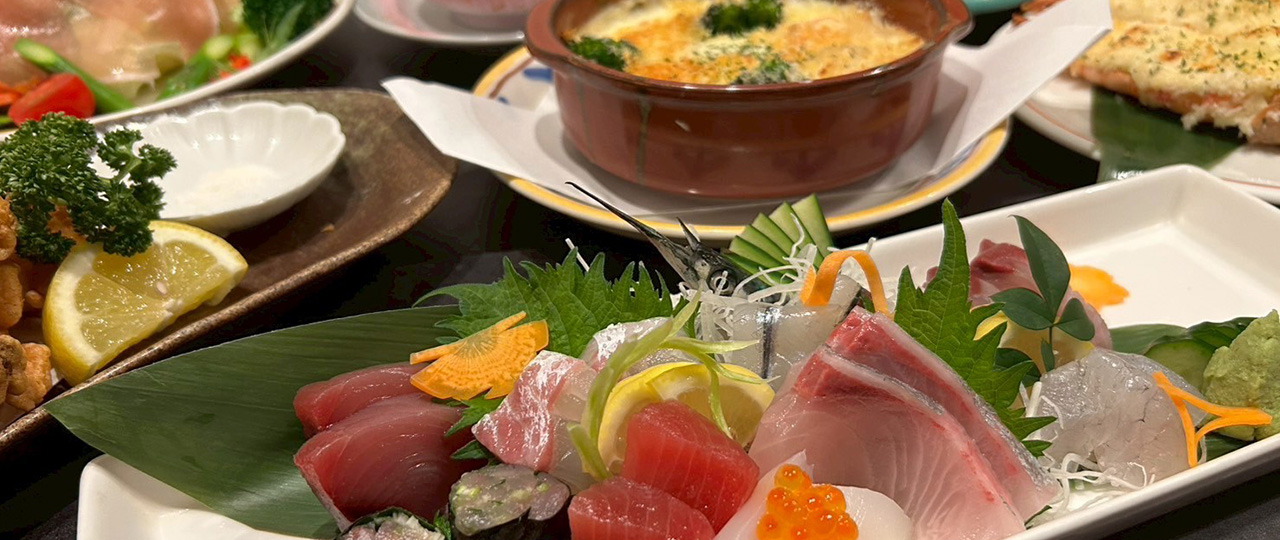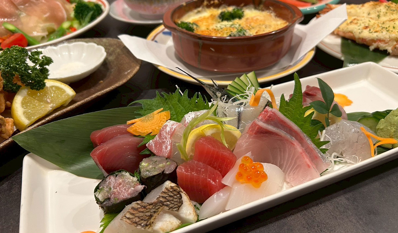 店内のいけすから取り出してさばくお造りをはじめ、「海鮮グラタン」など和洋織り交ぜた幅広いメニューをご用意。
